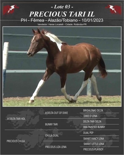 Pai – A DELTA TARI HDL: garanhão homozigoto do Haras Duas Lagoas, filho do grande A DELTA OUT OF DIXIE, Campeão Brasileiro de Apartação em uma mãe BUNNY TARI matriz importada.