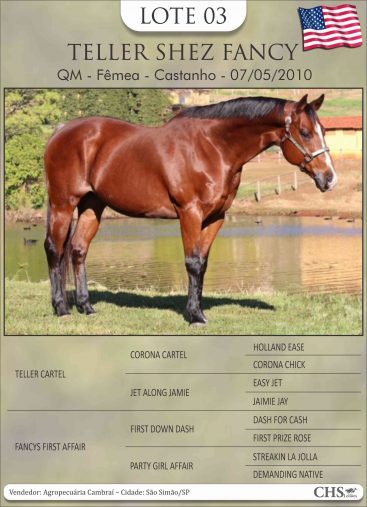 Pai – TELLER CARTEL : Campeão AQHA. Ganhador do All American Futurity (G1). Terceiro no Golden State Million Futurity (G1). Finalista no Los Alamitos Million Futurity (G1). US$ 1.212.471,00 em prêmios. Produziu ganhadores de mais de US$ 7.500.000,00 em prêmios. Destaque para: Llano Teller: 11 vitórias e US$ 1.770.007,00 em prêmios. Vencedor do All American Derby (G1); do Ruidoso Derby (G1); do Remington Park Futurity (G1); do Remington Championship Challenge (G2). Cartel Quick: 2 vitórias e US$ 317.100,00 em prêmios. Vencedor do Ruidoso Futurity (G1). Que tem em sua linhagem CORONA CARTEL AAA-97. Ganhador clássico de 6 corridas, U$557.142,00 em prêmios. 1º no Los Alamitos Million Futurity (G1), 1º Kindergarten Fututurity (G2), 1º Tiny´s Gay H., Finalista do PcQHRA Breeder´s Derby (G2), Vandy’s Flash.H.(G3), etc. MAIOR REPRODUTOR POR SOMAS GANHAS EM ATIVIDADE NO MUNDO. Com 15 gerações em idade de corrida, é pai de 1039 ROMs, 76 ganhadores clássicos, 58 Superior Race Awards, 24 Champions e 1 Campeão Mundial, que já acumulam U$47.213.595,00 em prêmios.