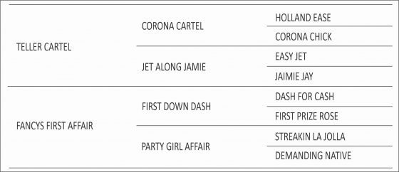 CORONA CARTEL: AAA-96. Ganhador clássico com 3 vitórias e U$70.554,00 em prêmios. 1º no Califórnia Derby Challenge (G3), Finalista do Golden State Derby (G1), do AQHA Derby Challenge Championship (G1), do El Primero Del Ano Derby (G1), do Califórnia Challenge Championship (G2), do Califórnia Juvenile Challenge (G3), do Rheudasil H. e do Whosleavingwho Handicap. Com 8 gerações em idade de Corrida é pai de 177 ROMs, 12 ganhadores clássicos, 3 Superior Race Awards, 2 Regional Champions e 1 Champion que totalizam U$5.821.907,00 em prêmios, com destaque para: TURBULENT TIMES, AAA-94, 5 vitórias até 3 anos e U$564.146,00 em prêmios, 1º no Golden State Million Futurity (G1), etc.; BRACE FOR BERNAL, AAAT-105, 9 vitórias até 3 anos, U$322.326,00 em prêmios, AQHA Racing Champion Three-year-old Colt, 1º no Heritage Place Derby (G2), 1º no Will Rogers Juvenile Challenge, 1º no Bill Hedge Memorial S., 1º no Remington Park Oklahoma Bred Derby , etc.; QUATRO MENUDOS, AAAT- 104, 6 vitórias e U$300.386,00 em prêmios, 1º no New Mexico Classic Derby (G2), 1º no Shue Fly S. (G2), 2º no Jess Burner Memorial H.(G1), etc.; FURY OF THE STORM, AAA-93, 6 vitórias até 3 anos e U$292.291,00 em prêmios, New Mexico Hi-Pt Three-Year-Old Gelding 1º no New Mexico Hba S.(G2), 1º no New Mexico Breeders S.(G2), 1º no Zia Derby (G3), 2º no Namehimastreaker New Mexico Classic Championship (G1), etc.; RECKLESS WIND, AAA-95, 6 vitórias e U$177.680,00 em prêmios, 3º no Zia H. (G2), etc.