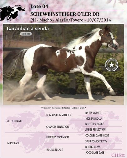 Mãe – MASK LACE: Matriz Paint horse, mãe de garanhões como SCHEWEINSTEIGER O’LER DR e ENZO O’LER DR, seus filhos são cruzamentos com garanhões renomados, tais eles: TM DELTA TARI DREAMER; FLYERCAT PEA; BROTHER TUMBLEWEED, COLOR ME SLADE e ZIP BY CHANCE.
