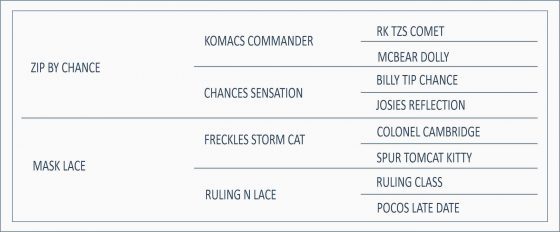 Pai –  ZIP BY CHANCE: Importado. Homozigoto. Linhagem de Trabalho. Reprodutor que foi sucesso de venda de coberturas no Brasil e se comprovou como ótimo pai, tendo seus produtos, além da bela pelagem, muita estrutura, morfologia diferenciada e temperamento espetacular.