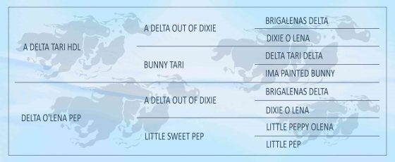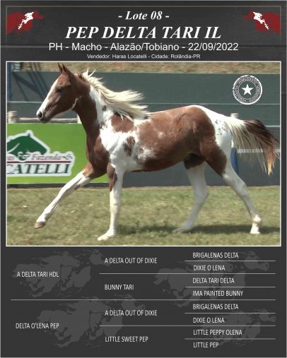 A DELTA OUT OF DIXIE: Importado. Reservado Campeão Super Stakes Classic ANCA/02 e 03, Finalista Super Stakes Classic/03 e 04, possui a segunda maior nota da ANCA(77), conferida por um juiz americano (Bill Glass), Campeão III Camp. Nacional ABCPaint/03 – Aparatação, Grande Campeão V Congresso Brasileiro ABCPaint Apartação – Aberta, Res.Campeão IV Camp. Nacional ABCPaint/04 – Apartação Aberta – Res. Campeão Super Stakes Classic ANCA 02 / 03 – Finalista Super Stakes Classic ANCA 03 / 04 – Possui a segunda maior nota da ANCA (77 pontos) conferida por um juiz americano (Bill Glass) – Campeão Nacional ABC PAINT / 03 – Apartação – Ab – Campeão Congresso ABC Paint – Apartação – Ab – 6º Lugar Campeonato Nacional ANCA 03 / 04 – Ab. Além de ser campeão, ter pedigree de campeões, seus filhos vem se destacando nas competiçoes, entre eles: west collors day tmr (grande campeao vii campeonato nacional abc paint/2007-2008-apartação aberta e amador, res. Grande campeao vii potro do futuro abc paint/2007-apartação amador); indian’s day tmr (grande campeão potro do futuro abc paint/2007 apartação amador e reservado aberta); mr delta peppy ht (grande campeao vii potro do futuro/2007-apartração aberta); delta badger iqv (grande campeão potro do futuro /2008-working penning-aberta e amador); tina delta (grande campeã vii potro do futuro/2008 laço de bezerro tecnico aberta e amador); delta wood lena (res. Grande campea viii potro do futuro/2008-redeas aberta); x-safira delta hng (grande campeao vii potro do futuro abc paint/2007 team penning amador e reservado aberta, grande campeã x congresso brasileiro abc paint-team penning aberta, laço brzerro amador e working penning aberta e reservada amador, etc).