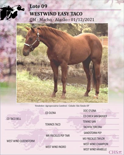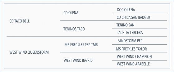 Pai – CD TACO BELL: RMT (24 pts) importado -abqm awards 2014 como garanhao produtor de working cow horse. Campeão Latin Americam Championship 2013, Tri Campeão em Performance halter ABQM e AQHA Aberta e amador, 2º. colocado 6a. Copa dos Campeões 2012, 1º. colocado 2a. etapa Campeonato Paulista 2012, 1º. colocado 26ª.prova oficial AQHA aberta SENIOR, 2º. colocado 1º. LATIN AMERICAN CHAMPIONSHIP AMADOR, 3º. colocado 22º.CONGRESSO BRASILEIRO 2012, aberta sênior. 4º. colocado 2º. Futurity performance 2008 , 1º. colocado 1a. etapa XVII campeonato NQMRP amador, 1º. colocado potro do futuro 2008/2009 NQMRP aberta, 1º. colocado 2ª. etapa XVII campeonato NQMRP aberta junior, 1º. colocado 2ª. etapa XVII campeonato NQMRP amador, 1º. colocado 3ª. etapa Campeonato mineiro de apartação, 3º. XXª. prova oficial AQHA aberta junior, Top ten IXX Congresso ABQM 2009. Produtor de 630 pontos na abqm, pai de WESTWIND RENEGATE BELL (rmt) WESTWIND RHEA BELLE (rmt) WESTWIND SMARTY (rmt) . WESTWIND ROGER TACO RMT, finalist pf tambor 2012 campeao , com 264 pontos.
