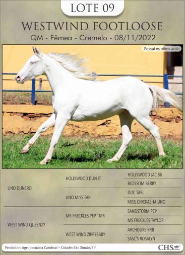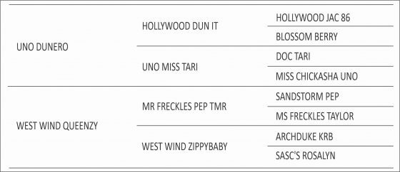 Mãe – WEST WIND QUEENZY: Matriz Quarto de Milha, pontuada com 11 pontos pela ABQM, em modalidades de Ranch Sorting e Team Penning. Com destaque para WESTWIND BULET TWIST, com 8,5 pontos.