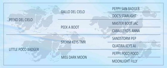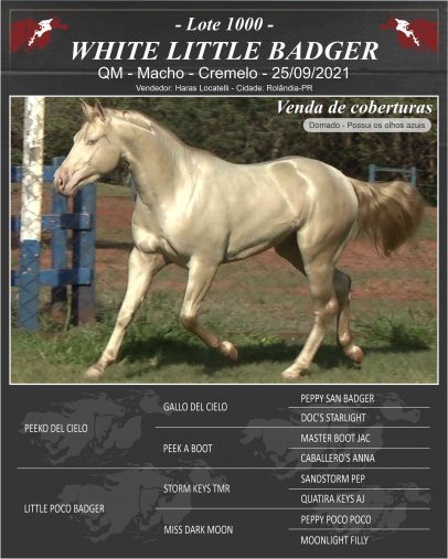 Mãe – LITTLE POCO BADGER: Matriz Quarto de Milha, possui onze filhos registrados na ABQM, entre eles três são pontuados em modalidades como: Laço comprido, Laço em dupla e Vaquejada.