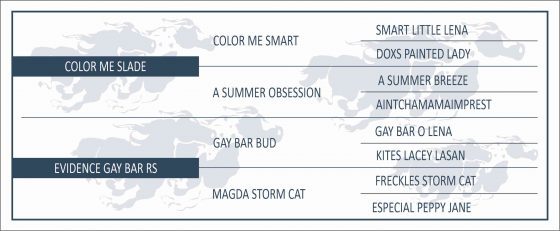 Pai – COLOR ME SLADE (Premiado em Rédeas pela NRHA e produtor de Campeões pela APHA). Filho do melhor cavalo dos EUA nos dias de hoje, o Campeão Mundial Color Me Smart (Smart Little Lena), produtor de mais de U$ 3.000.000,00. Sua dupla homozigose garante genes dominantes para pelagem Pintada