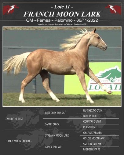 Mãe – FANCY MOON LARK R13: Matriz Quarto de Milha, possui cinco filhos registrados.