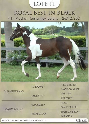 Pai – TM B LINESBESTINBLACK: Importado. Homozigoto. Linhagem de Trabalho. No Brasil, em sua primeira geração destaque para: SHOWHORSE INBLACK TH (Grande camp. V Congresso ABCPaint/04 Conformação Ab, Res. grande campeão V Congresso ABCPaint/04 – Amador, 1º Lugar II Etapa IX Campeonato Nacional ABCPaint/04 – Aberta e Amador, 1º Lugar IV Etapa do IV Campeonato Nacional ANC Paint/04 Aberta e Amador, 2º Lugar V Etapa IX Campeonato Nacional ABCPaint/04 – Aberta e Anador). SAMIRA JET INBLACK HSEL, Campeã Nacional ABCPAINT TEAM PENNING AM E AM MASTER, Campeã Nacional 3 TAMBORES AM PR, RES Campeã Nacional TEAM PENNING AB, 3 TAMBORES AM ETC. Possui Vários 1º lugares em 3 Tambores Em Provas Regionais.