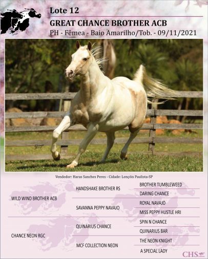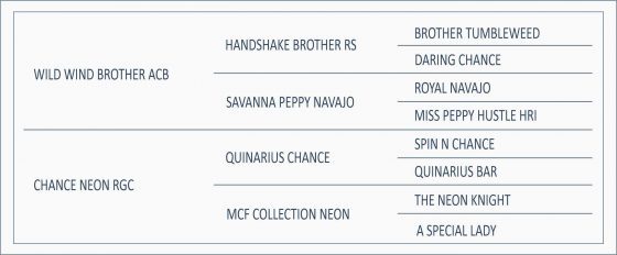 Mãe – CHANCE NEON RGC: Matriz Paint, possui em média sete animais registrados, filhos de garanhões conhecidos, como: CHEROKEE TREASURED, HANDSHAKE BROTHER RS, LS DUN IT IN STYLE, entre outros. Filha do garanhão Quarto de Milha, QUINARIUS CHANCE.