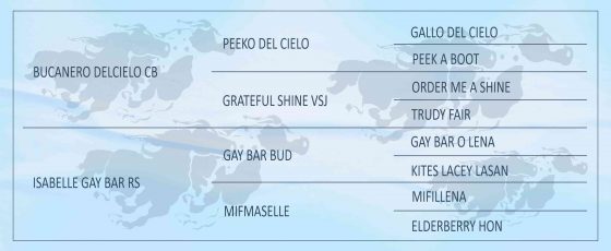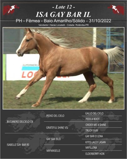 GAY BAR OLENA: Bi Campeão Mundial Rédeas, Reservado Campeão Mundial _ Rédeas.Registro de Mérito e Superior. Pai de CATCHUL GAY BAR (Registro de Mérito Open em Laço de Bezerro, Laço Cabeça e Superior Laço-Bezerro/ Registro de Mérito Amador em Laço Bezerro, Laço Cabeça e Breakway Roping), DELTA LENA LADY(Registro de Mérito e Superior Rédeas Open e Registro de Mérito Rédeas); COLORED BY BAILEY( Certificado de Reconhecimento APHA _ Team Penning); PATTY PAINTS (Registro de Mérito e Superior Working Cowhorse; Open;Registro de Mérito em Três Tambores, Laço Cabeça, Laço Pé, Seis Balizas, Rédeas, Steer Stoping, Três Tambores e Working Cowhorse );GAY BAR FLY(Registro de Mérito em Rédeas Open ); GAY BAR LASAN (Registro de Mérito em Working Cowhorse Open; Redeas Amador; Certificado de Reconhecimento APHA em Team Penning com 170 pontos – Campeão Mundial de Rédeas APHA / 95 – Jr – Res. Campeão Mundial de Rédeas APHA / 97 – Sr – Campeão Mundial de RédeasAPHA / 98 Sr – APHA Superior Reining – NRHA Reining Earner – Produtor de inúmeros campeões de Rédeas , Working Cow Horse e Laço, pela APHA.