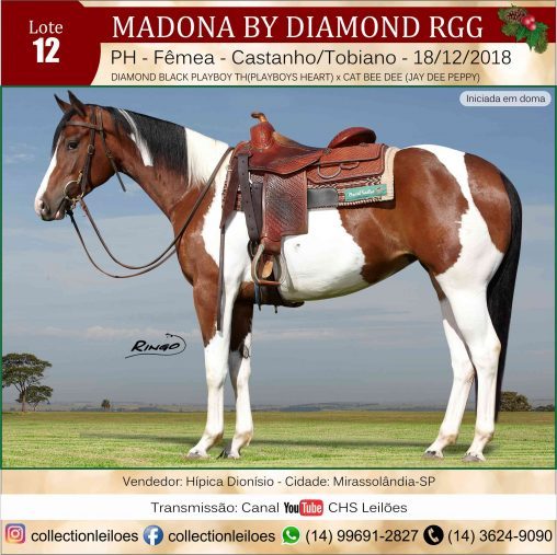 Pai – DIAMOND BLACK PLAYBOY TH: Por Playboys Heart. Garanhão com sangue dos maiores reprodutores QMs de Apartação em todos os tempos. Seu pai, PLAYBOYS HEART, é o único neto Paint Horse de FRECKLES PLAYBOY, Garanhão Campeão Mundial de Apartação e um dos 5 melhores reprodutores de todos os tempos na modalidade. Sua mãe é neta de HIGH BROW CAT, Reprodutor Nº1 de Apartação em todos os tempos, tendo produzido mais de U$76 Milhões. Em sua linha materna possui novamente o sangue de FRECKLES PLAYBOY e o consagrado sangue do lendário DOC O’LENA.