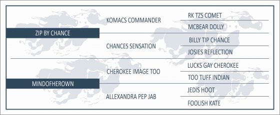 Mãe – MINDOFHEROWN: Matriz, importada, filha de CHEROKEE IMAGE TOO: AAA, produtor de Campeões de Baliza e Tambor.