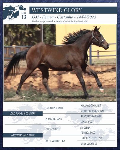 Mãe – WESTWIND WILD BELLE: Matriz pontuada em Ranch Sorting e Team Penning, 3º Lugar na 2ª Etapa Copa West Wind. Possui 4,5 pontos pela ABQM.