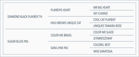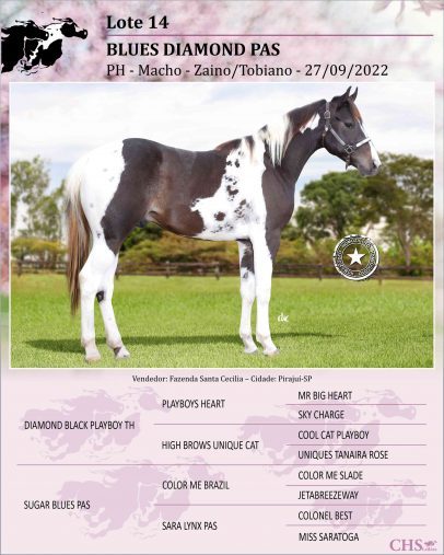 Pai – DIAMOND BLACK PLAYBOY TH: Por Playboys Heart. Garanhão com sangue dos maiores reprodutores QMs de Apartação em todos os tempos. Seu pai, PLAYBOYS HEART, é o único neto Paint Horse de FRECKLES PLAYBOY, Garanhão Campeão Mundial de Apartação e um dos 5 melhores reprodutores de todos os tempos na modalidade. Sua mãe é neta de HIGH BROW CAT, Reprodutor Nº1 de Apartação em todos os tempos, tendo produzido mais de U$76 Milhões. Em sua linha materna possui novamente o sangue de FRECKLES PLAYBOY e o consagrado sangue do lendário DOC O’LENA.