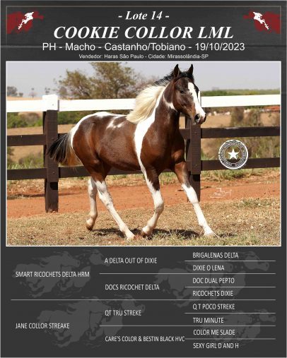 DOCS RICOCHET DELTA: Matriz Paint Horse, mãe de BIBI DOC’S DIXIE BFP( A Delta Out Of Dixie) , Campeã Potro Do Futuro Laço Comprido Am Pr,3º Lugar Potro Do Futuro Laço Comprido Técnico Am,2x Campeã Nacional Laço Comprido Técnico Ab E Am, PEPTO DELTA – TE (A Delta Out Of Dixie) Campeão Nacional ABCPAINT Laço Comprido Amazonas, 4º Lugar Campeonato Nacional Laço Comprido Técnico Ab etc. Seu pai DOC DUAL PEPTO, irmão próprio de NITRO DUAL DOC. É pai de PEPTO DUAL BAR, Top Ten Derby ANCA e Finalista Potro do Futuro Mineiro Apartação.