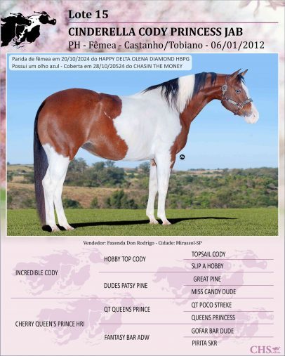 Mãe – CHERRY QUEEN’S PRINCE HRI: Matriz Paint Horse, possui registro de mérito na ABC Paint, Reservada Grande Campeã do IVº POTRO DO FUTURO DE TRABALHO, em rédeas, categoria amador.