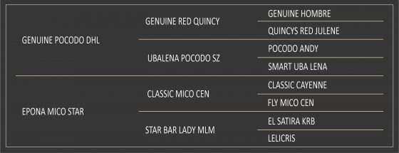 Mãe – EPONA MICO STAR: Matriz Quarto de Milha, filha do CLASSIC MICO CEN, garanhão que possui 54,5 Pts na AQBM, produtor de MICO RED BOY, Res.Campeão Nacional ABQM/10 em Laço em Dupla (Amador), e, de KIM FLY MICO, pontuado na ABQM com 24 pts em Laço Comprido e Top 10 no Campeonato Nacional/15 em Laço Comprido (Aberta Armada).
