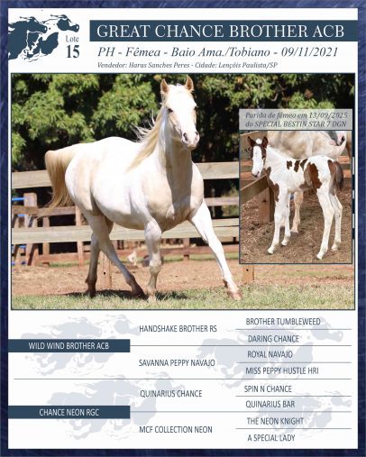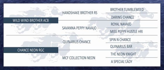 Mãe – CHANCE NEON RGC: Matriz Paint, possui em média sete animais registrados, filhos de garanhões conhecidos, como: CHEROKEE TREASURED, HANDSHAKE BROTHER RS, LS DUN IT IN STYLE, entre outros. Filha do garanhão Quarto de Milha, QUINARIUS CHANCE.