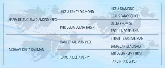 Mãe – MOHAVE DELTA KALIMAN: Matriz Paint Horse, filha do triplo homozigoto BANDIT KALIMAN PCO em uma mãe DAKOTA DELTA PEPPY.