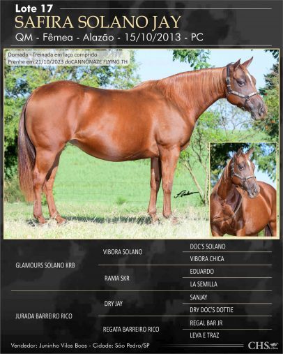 SAFIRA SOLANO JAY: Prenhe em 21/10/2023 do CANNONAZE FLYING TH – Domada – Treinada em Laço comprido. Matriz Quarto de Milha, filha do garanhão GLAMOURS SOLANO KRB.