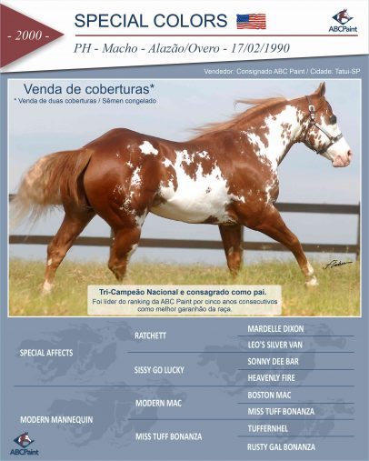 SPECIAL COLORS: APHA, Reprodutor Paint Horse nascido em 1990 no Texas, filho do Campeão Mundial SPECIAL AFFECTS, SPECIAL COLORS obteve 15 pontos em Halter e 15 pontos em Western Pleasure nos EUA, é Top Tem do Paint Horse no Brasil, Tri-Campeão Nacional, foi Grande Campeão Brasileiro da raça Paint/96, Reservado Campeão Expo-Bauru/96, produtor de Campeões Nacionais destacando-se a Tri-Campeã Nacional 95/96, a Bi-Campeã Nacional e o Campeão Potro Nacional na Expo Bauru, Bi Campeão Nacional 97/98. Pai de Pokahontas Star Colors, 1º lugar tambor no Ranking da Associação Brasileira de Cavalo de Trabalho. Produziu NIGER COLORS RT (Reservado Campeão Nacional _ 1998, 2º Lugar na Categoria Machos 3 anos noIV Campeonato Nacional de Conformação 1999, perdendo somente para seu pai SPECIAL COLORS); PRINCIPE COLORS RT e seu pai são os únicos TOP TEN do Brasil (Grande Campeão Nacional e inúmeros Campeonatos de Categoria), os dois Garanhões SPECIAL E NIGER, deram ao Haras Terra o maior número de Campeonatos nas etapas da Associação do Paint Horse, proporcionando ao criador o único Tri-Campeão Nacional como melhor criador, e na Etapa V Campeonato Nacional Presidente Prudente-SP 2000 obteve Registro de Mérito Conformação 1 ponto. Special foi o 1º Top Tem do Brasil e hoje é sindicalizado e Comprovado o Melhor reprodutor PH do Brasil. Até 2005 é o 1º no Ranking Geral de reprodutor de Reg. De Mérito de Conformação e 4º no Ranking Geral de registro de mérito de Trabalho. Pai de POKAHONTAS STAR COLORS (1º lugar Tambor no Ranking da Associação Brasileira de Cvalo de Trabalho), GREAT COLORS STAR (Grande Campeão II Potro do Futuro ABC Paint/2002 – Conformação Aberta e Amador, Reservado Grande Campeão VII Campeonato Nacional ABC Paint/2002 -Conformação Aberta e Amador, Grande Campeão IV Copa das Américas/2003 – Conformação Aberta e Amador, Grande Campeão IV Congresso ABC Paint/2003, Grande Campeão VIII Campeonato nacional ABC Paint/2003 Conformação Aberta e AMdor, MCF Special Decisive (Res. Grande Campeão IV Copa das Américas/2003 – Conformação Aberta e Amador, Res. Grande Campeão VII Campeonato Nacional ABC Paint/2003 – Conformação A mador, Grande Campeão I Futurity Mega Halter/2004 – Aberta,Grande Campeão do V Congresso Brasileiro ABC Paint/2004 – Aberta e Amador – Campeão APHA – Campeão ABC Paint – Registro de Mérito Superior – Líder em Conformação no Ranking dos Garanhões.
