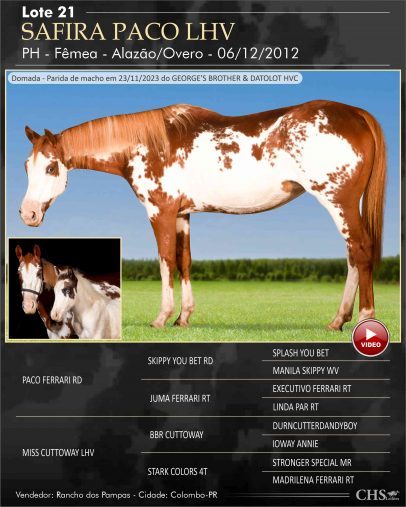 Pai – PACO FERRARI RD: Garanhão Paint Horse, Alazão/Overo, seu pai é SKIPPY YOU BET RD (Campeão em Conformação).
