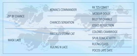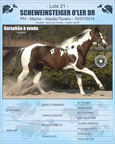 Mãe – MASK LACE: Matriz Paint horse, mãe de garanhões como SCHEWEINSTEIGER O’LER DR e ENZO O’LER DR, seus filhos são cruzamentos com garanhões renomados, tais eles: TM DELTA TARI DREAMER; FLYERCAT PEA; BROTHER TUMBLEWEED, COLOR ME SLADE e ZIP BY CHANCE.