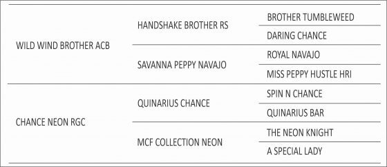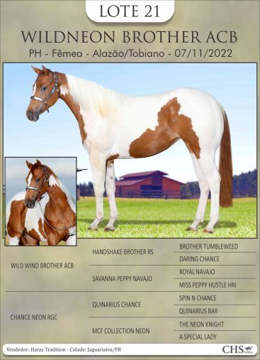Mãe – CHANCE NEON RGC: Matriz Paint, possui em média sete animais registrados, filhos de garanhões conhecidos, como: CHEROKEE TREASURED, HANDSHAKE BROTHER RS, LS DUN IT IN STYLE, entre outros. Filha do garanhão Quarto de Milha, QUINARIUS CHANCE.