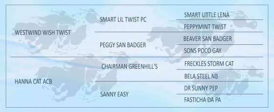 Pai – WESTWIND WISH TWIST: Garanhão Quarto de Milha, pontuado em Ranch Sorting pela ABQM. Possui dez pontos, abaixo temos alguns de seus títulos, sendo 6º colocado em Ranch Sorting Potro do Futuro – Amador – 19 anos ou mais, no 38º Potro do Futuro da Raça Quarto de Milha (2017); 1º colocado em Ranch Sorting – Amador – Master no 4º Campeonato de RANCH SORTING ABQM/LESTE PAULISTA (2018); 2º lugar no 1º Campeonato Ranch Sorting Brazil – Ranch Sorting Derby – Aberta (2018); 8º colocado na 2ª Etapa – 3º Campeonato RSBR – Ranch Sorting – Amador – Light (2021); 5º Lugar na 2ª Etapa Campeonato de Ranch Sorting Liga Leste Paulista 22/23 – Ranch Sorting – Amador – Principiante (2023).
