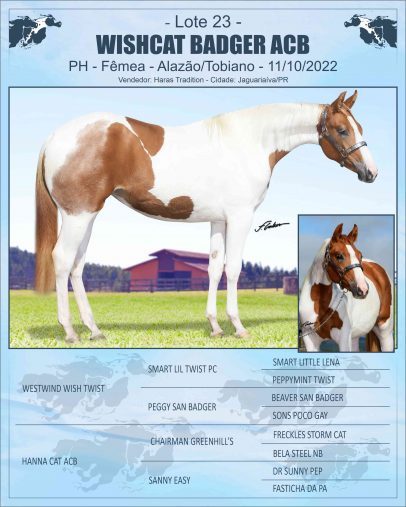 Mãe – HANNA CAT ACB: Matriz Paint Horse, possui 75,5 pontos de Registro de Mérito pela ABC Paint. Grande Campeã Nacional em diversas modalidades de performance na ABC Paint, entre elas: Ranch Sorting, Working Penning, Team Penning. Neta de FRECKLES STORM CAT – APHA. Importado. Nos EUA possui Registro de Mérito em Rédeas (1995), Lifetime Perfomance Points (47), Reservado Campeão Mundial de Rédeas. No Brasil produziu animais pontuados em conformação e trabalho. E na sua linha baixa possui DR SUNNY PEP como avô.
