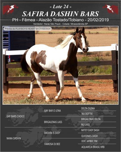 Mãe – NANA DASHIN: Matriz Quarto de Milha, filha do Importado DASHIN IS EASY, garanhão produtor em Três Tambores, possui atualmente 284 filhos registrados, sendo 35 deles pontuados, que somam 729 pts pela ABQM.