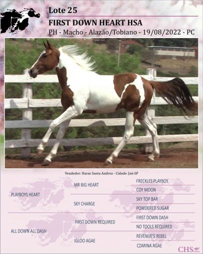Pai – PLAYBOYS HEART, Importado. Único neto homozigoto do lendário garanhão americano de Apartação, FRECKLES PLAYBOY. Produtor de: HEART SANADOC HSA, Campeão Nacional ABC Paint/17 em Três Tambores (Test Horse), etc.; FLY HEART TY AFFAIR, Campeã Nacional ABC Paint/17 em Conformação (Aberta-Fêmeas-1 ano), etc. Seu pai, MR BIG HEART, é ganhador de U$37.000,00 em Apartação, sendo Campeão do Abilene Spectacular 5/6YO Amateur, Campeão do Memphis Amateur Futurity, Campeão do Southern Cutting Amateur Futurity, Campeão do Margarita Classic, Res.Campeão do Campeonato Mundial APHA Futurity em Apartação e produtor de Campeões em Trabalho pela APHA. Seu avô paterno, FRECKLES PLAYBOY, é ganhador de U$59.976,00. Res.Campeão NCHA Futurity, Campeão Mundial AQHA de Apartação e 4º melhor reprodutor de Apartação em todos os tempos pela NCHA com +U$28.750.000,00 em produção.