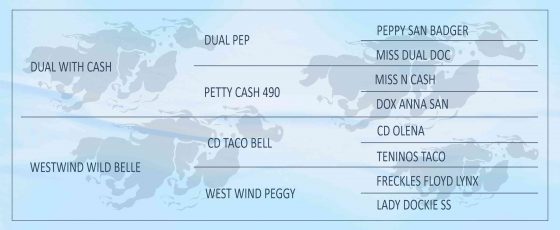 MISS DUAL DOC: Além de DUAL PEP, produziu, JUST MISTER DUAL, ganhador de U$32,510; PETTY CASH 490, U$136.652,00, NCHA Open Derby Co-Res. Champion. 1994 NCHA Open DERBY Reserve Champion;1994 NCHA Open Super Stakes Finalist; 1996 Abilene Spetacular Open Classic Champion Seus filhos ganharam mais de U$400.000,00