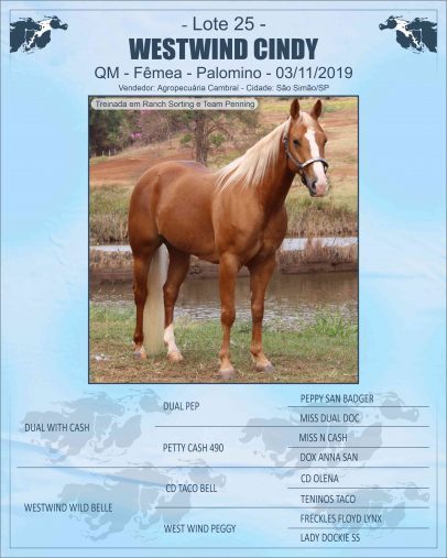 Mãe – WESTWIND WILD BELLE: Matriz pontuada em Ranch Sorting e Team Penning, 3º Lugar na 2ª Etapa Copa West Wind. Possui 4,5 pontos pela ABQM.