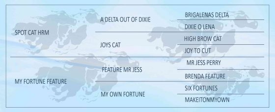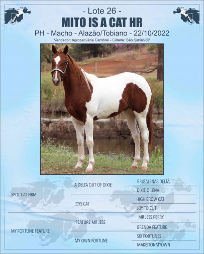 Pai – SPOT CAT HRM: Homozigoto. Res. Campeão Super Stakes Classic ANCA, Grande Campeão Nacional ABC Paint, 2a. maior nota de Apartacao da historia da ANCA no Brasilate hoje. Pai de Campeões em várias modalidades de Trabalho pela ABC Paint, entre eles: WEST COLLORS DAY TMR, Campeão Nacional ABC Paint Apartação Ab e Am, Ranch Sorting Am, team Penning Ab; CHANEL OF DIXIE, Campeã Nacional ABC Paint Laço Comprido Tec Ab; ANITA DELTA FLYER,Res Campeã Nacional ABC Paint Laço Comprido Ab e Am; PEPSI DIXIE HRM, Campeã Nacional ABC Paint Ranch Sorting Ab Team Penning Fem; ANA DELTA FLYER, res Campeã Potro Futuro ABC Paint Laço Comprido Am. Pai de FLICKA CAT HH, uma das melhores éguas da raça Paint Horse em 3 Tambores na atualidade, soma mais de R$ 14,2 mil em ganhos (SGP), ganhadora de inúmeras provas e rodeios.