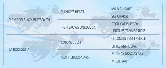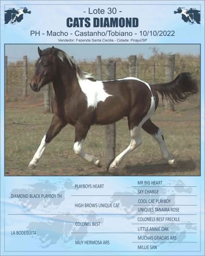 Pai – DIAMOND BLACK PLAYBOY TH: Por Playboys Heart. Garanhão com sangue dos maiores reprodutores QMs de Apartação em todos os tempos. Seu pai, PLAYBOYS HEART, é o único neto Paint Horse de FRECKLES PLAYBOY, Garanhão Campeão Mundial de Apartação e um dos 5 melhores reprodutores de todos os tempos na modalidade. Sua mãe é neta de HIGH BROW CAT, Reprodutor Nº1 de Apartação em todos os tempos, tendo produzido mais de U$76 Milhões. Em sua linha materna possui novamente o sangue de FRECKLES PLAYBOY e o consagrado sangue do lendário DOC O’LENA.