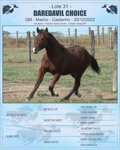 TASTERS CHOICE: AQHA, Importado, seus filhos somam 1222,5 pontos em 9 modalidades ABQM, R$74.490 pela ANCA, com destaque para: THUNDER CHOICE POCO, 154 pontos em Ranch Sorting – 2º Lugar no 32º Congresso Brasileiro da Raça Quarto de Milha 2023; ANITA CHOICE: 90 pontos de RMT em Ranch Sorting e Team Penning. Res. Campeã Congresso ABQM/19 – Team Penning (Amador); 3ºL Potro do Futuro ABQM/17 – Ranch Sorting (Amador); PEPPYS FROM CHOICE 65,25 pontos, RMT Aberta e Amador, Superior em Apartação, R$59.729 e 110 pontos pela ANCA, Campeã Futurity ANCA Ab, Campeã Copa dos Campeões ABQM Apartação Am,Res Campeã Congresso ABQM Apartação Ab Sr, Res Campeã Derby Classic ANCA Non Pro etc. APLEY CHOICE 43 pontos, RMT Aberta, Superior em Laço em Dupla Aberta, Res Campeão Congresso ABQM Laço em Dupla Ab Lv etc.